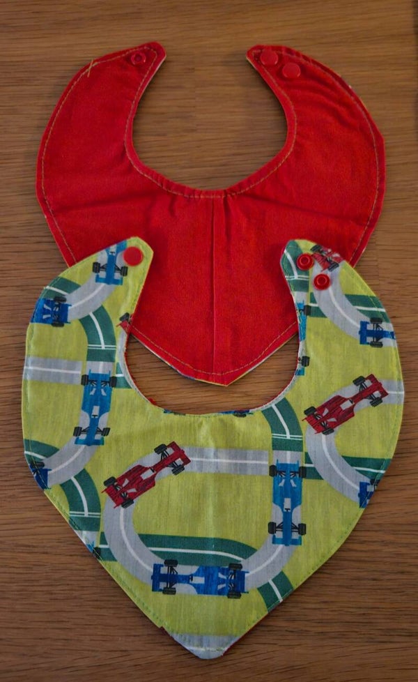 Lätzli / Dreieckstuch mit Rennautosujet, grün/rot.
