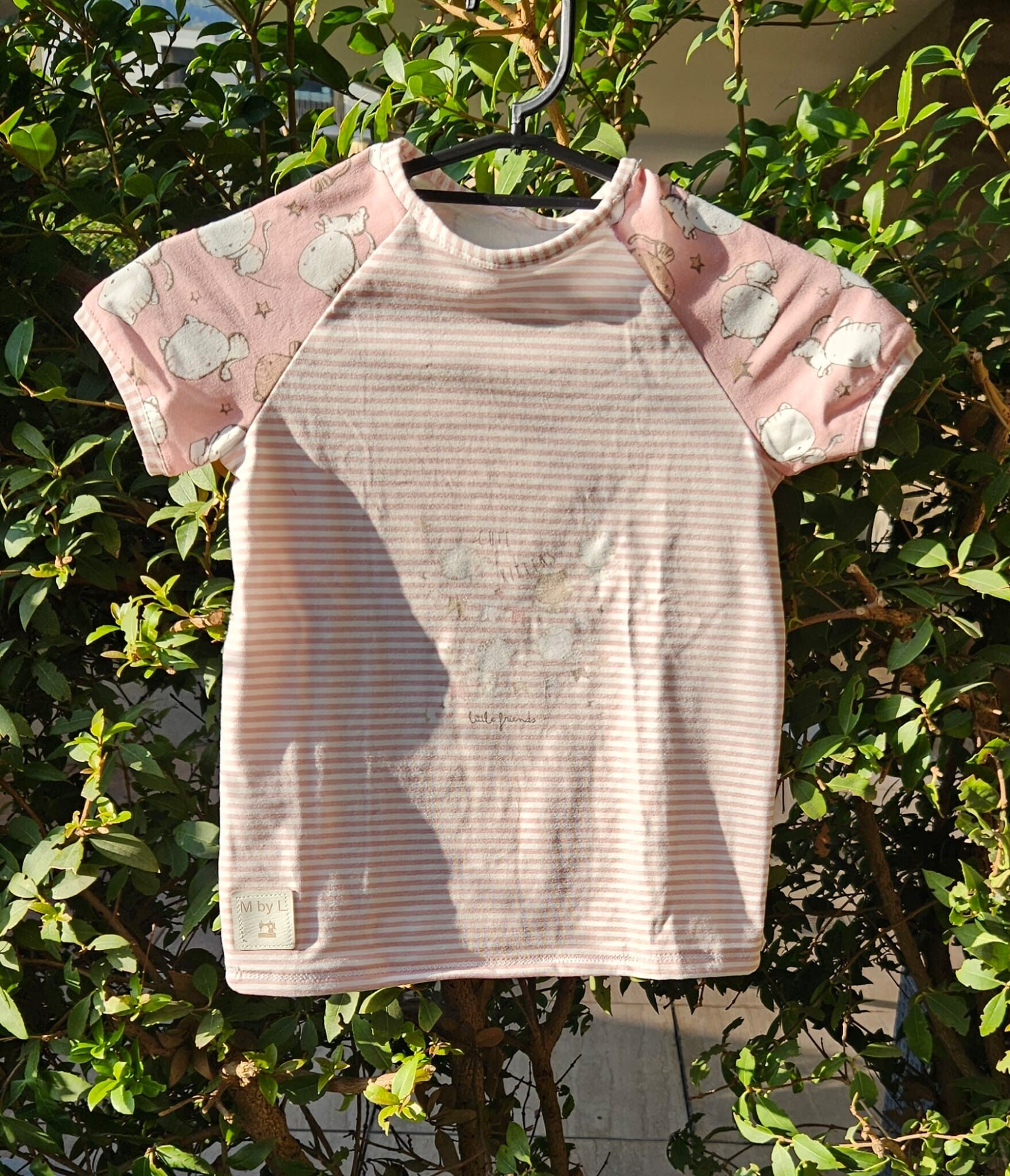 Farbe: Katzen-Sujet in Pink mit kurzen Ärmel. Vorderteil weiss/pink gestreift. Rückenteil in Pink mit Katzen-Sujet. Ohne Bündnchen.